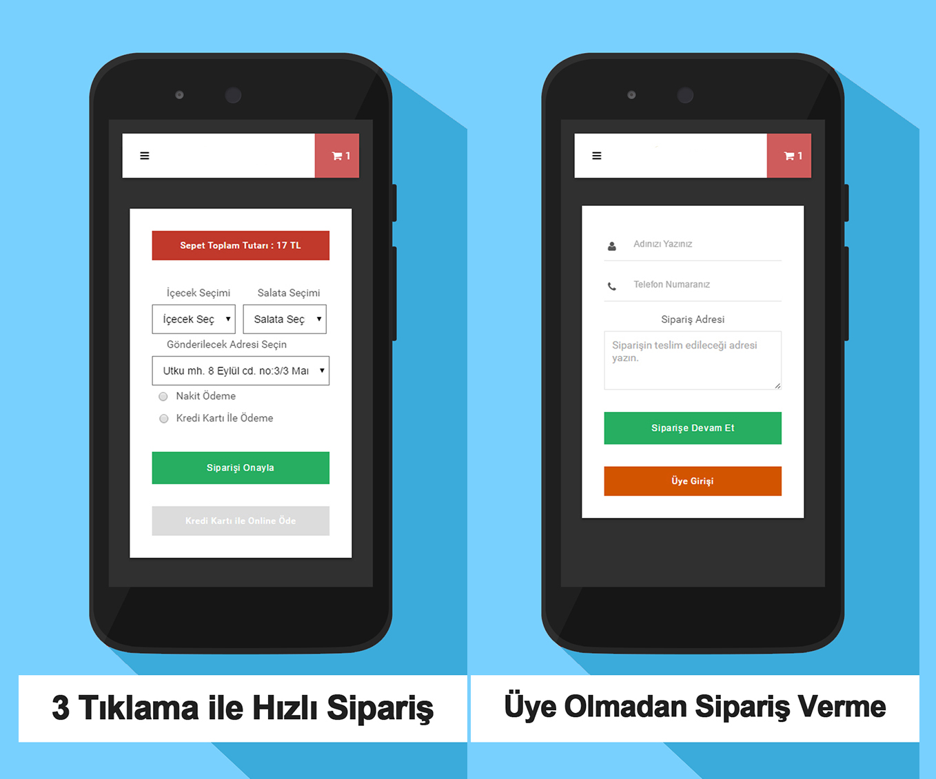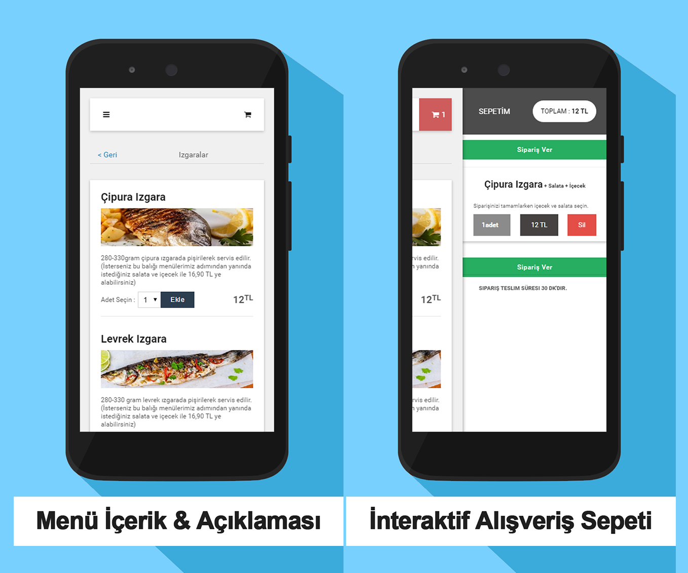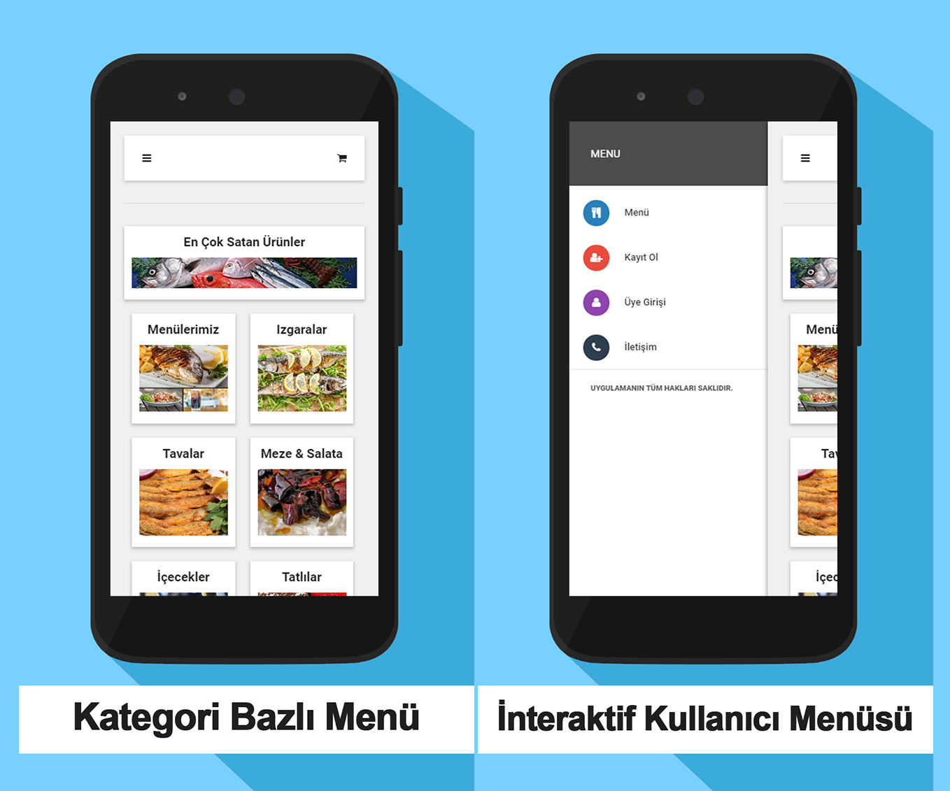 Mobil sipariş uygulaması ile, firmanıza yada restorantınıza özel uygulamalar yazıyoruz. Android ve Ios patlformlarında sunulan mobil sipariş uygulaması sayesinde, üye kayıtlı yada üye kaydı olmadan 3 tık ile sipariş alabilir, bunları detaylı olarak raporlayabilirsiniz.
